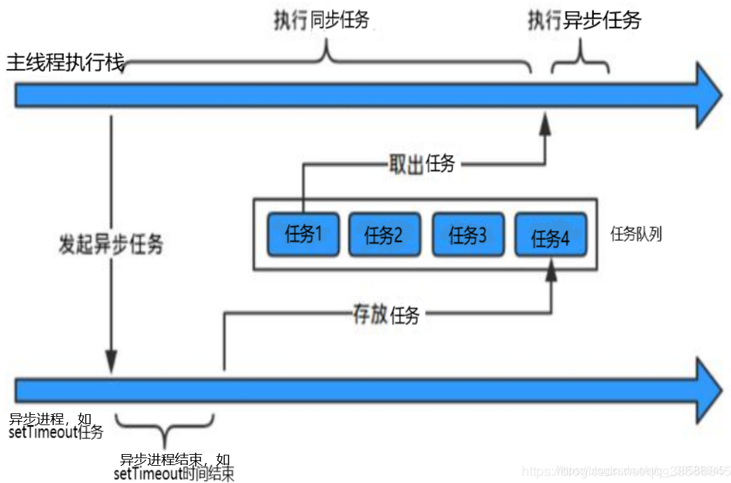 4. 等到运行栈里面的同步任务全部运行完毕后再到“任务队列”中读取异步任务②,这个时候setTimeout里面的函数体就会变成同步任务。